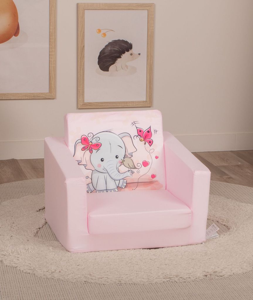 Baby Elephant – En underbar bäddfåtölj där varje liten drömmare får en söt plats att vila huvudet och låta fantasin sväva fritt. Bäddfåtöljen är perfekt för både lek och vila! Klädd i rosa bomullstyg, pryds fåtöljen av en charmig design med en liten babyelefant som försiktigt balanserar en fågel på sin snabel medan en fjäril svävar bredvid. Med sin praktiska fällfunktion kan den enkelt omvandlas från en bekväm sittplats till en mysig viloplats, perfekt för stunder av avkoppling efter långa dagar av lek.