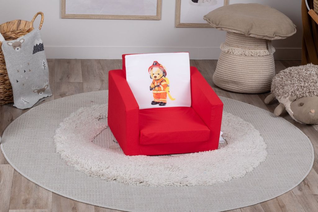 Denna fina bäddfåtölj är klädd i rött bomullstyg och pryds av en charmig nalle i brandmansutrustning – perfekt för små hjältar som drömmer om att släcka bränder och rädda dagen!