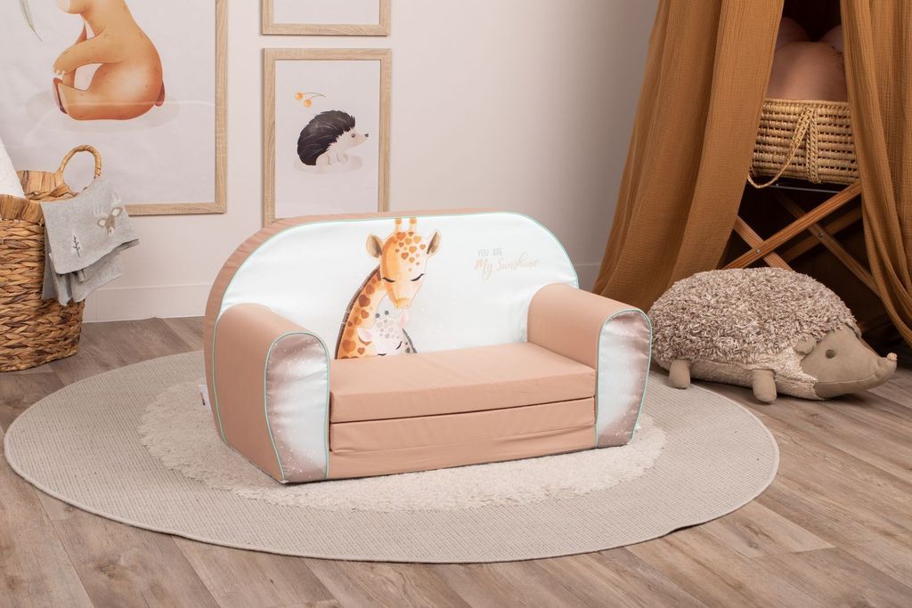 Den smarta och flexibla designen gör att soffan enkelt kan fällas ut till en liten säng, perfekt för både lek och vilostunder. Anpassad för barn mellan 9 månader och 4 år, erbjuder Giraffe Tall & Tiny en trygg och mjuk plats att växa och utvecklas på. Soffan är lätt vilket ger barnen friheten att själva ska kunna flytta runt den. Dessutom är allt innehåll tillverkat av skum som ger mjuka kanter och säkerställer en trygg användning.