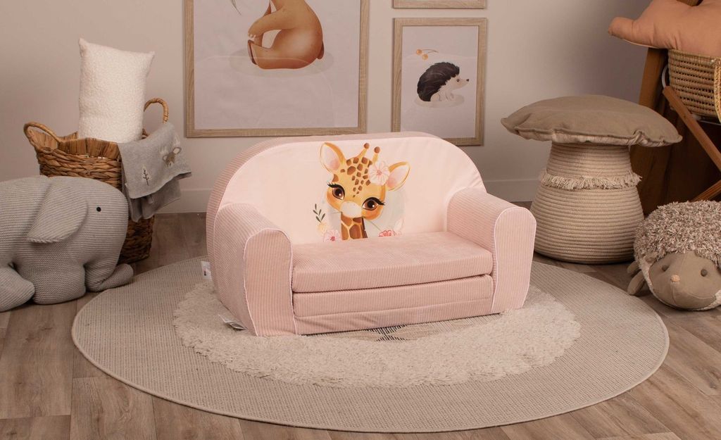 Sweet Giraffe! Denna charmiga bäddsoffa är klädd i lyxig rosa sammet och manchester, vilket ger en underbar känsla av elegans och komfort. Med sitt förtjusande tryck av en giraff omgiven av blommor, blir Sweet Giraffe snabbt en älskad favorit i alla barnrum.