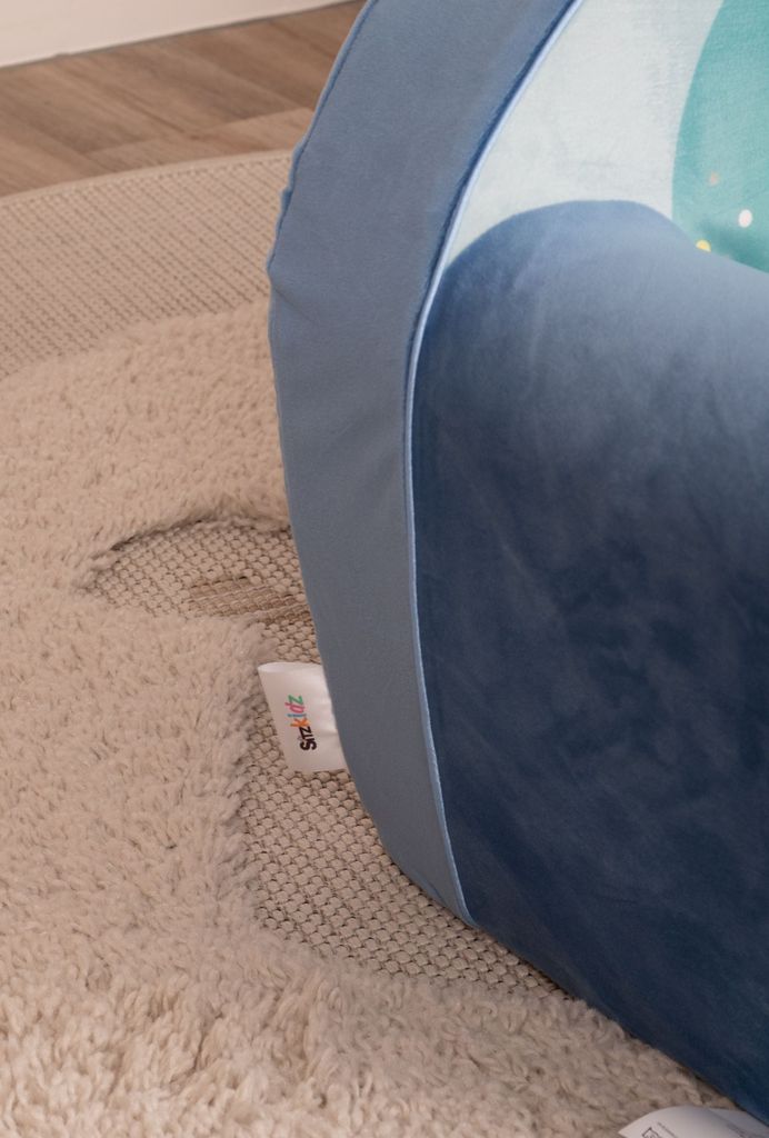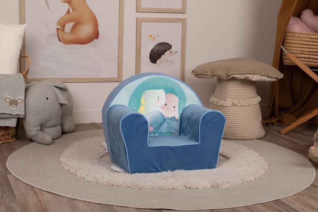 Dino Cuddles, den perfekta fåtöljen för alla små som älskar dinosaurier. Klädd i mjuk blå sammet med matchande passpoaler erbjuder denna fåtölj en härlig och bekväm sittplats. Det färgglada trycket av tre dinosaurier som kramar om varandra sprider glädje och värme, vilket gör den till en älskad del av barnrummet.