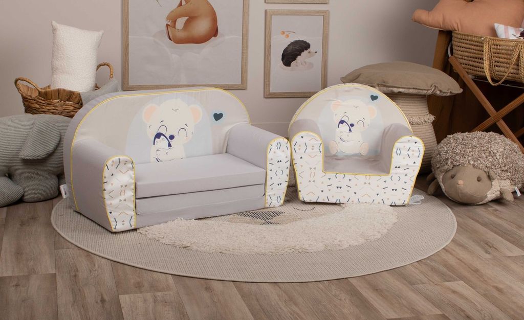 Frosty Friends - Denna charmiga barnfåtölj är klädd i bomullstyg, gula passpoaler och pryds av en söt isbjörn som kramar en pingvin, vilket ger en härlig känsla av värme och vänskap.