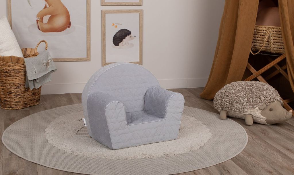 Grey Star – En stjärnklar plats för alla barn. Denna charmiga barnfåtölj är klädd i mjukt tyg som är quiltad med stjärnor som skapar en lekfull och mysig atmosfär i barnrummet. Den eleganta grå färgen ger en modern touch, perfekt för både lek och avkoppling.