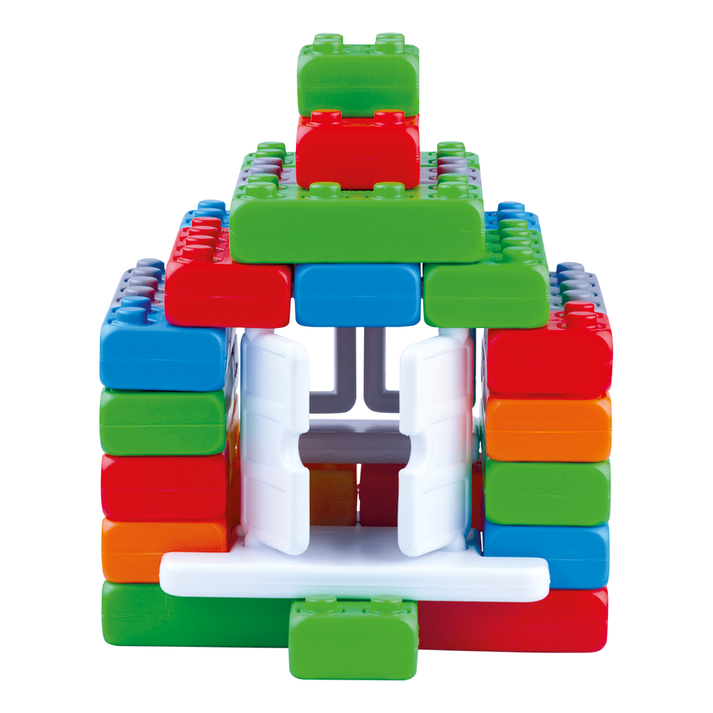 Setet består av 40 färgglada delar, inklusive bitar som gör det möjligt att bygga ett eget litet hus. Klossarna uppmuntrar till problemlösning, fantasi och fri kreativitet. De fungerar lika bra inomhus som utomhus och är dessutom lätta att packa ned och ta med på resor, besök eller till lekparken.